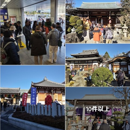 1月04日…七福神巡り、谷中にて、参加者:18名 毎年恒例の七福神巡り、今年は谷中の七福神で、18人の方々と一緒に行ってきました。コースは、田端駅集合13:00→①東覚寺(福禄寿)→②青雲寺(恵比寿)→③修性院 (布袋尊)→④天王寺(毘沙門天)→⑤長安寺(寿老人)→⑥護国院(大黒天)→⑦不忍池弁天堂 (弁財天)→上野公園不忍池→懇親会で、最後の弁天堂は、物凄い混雑で50分くらい並びました。15時を過ぎると急に冷え込んだため、待っている時に数人の方は焼酎を賞味していました。 ![]()