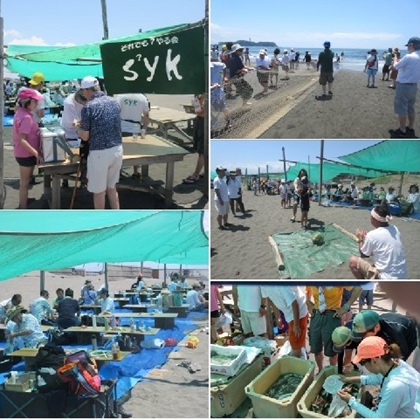 7月13日…地引網、鵠沼海岸にて、参加者:71名 藤沢市の鵠沼海岸にて「地引網」を実施しました。71名の仲間が集まり、網を引いた後、子どもたちによるスイカ割りも行いました。取れた魚とシラスは、参加者に持って帰ってもらいましたが、余るほどでした。 ![]()