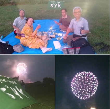 8月02日…江戸川区花火大会、参加者:5名 50周年記念の江戸川花火を肴に納涼会を開催しました。土と草の上は嘘のように涼しい河川敷です。 ![]()